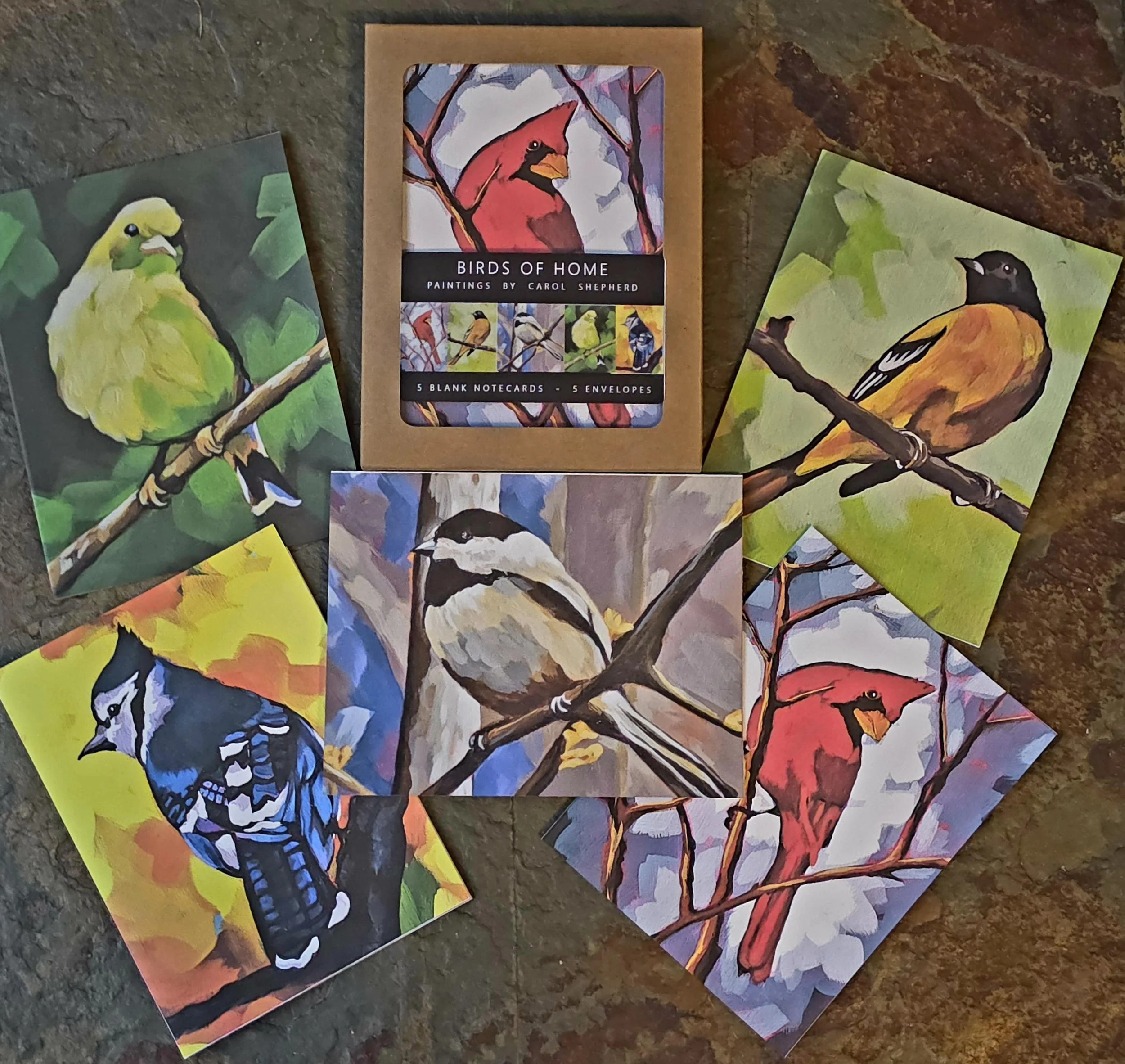 5 Notecards of different birds featured in my “Birds of Home” collection. Each box includes a Chickadee, a Blue Jay, a Yellow Finch, an Orange Tanager and a Cardinal. The cards are high quality prints on 100# card stock of my original artwork. The cards are folded to 4.25 x just over 5.5 inches and come with white self-sealing envelopes. They are left blank for your own messages.