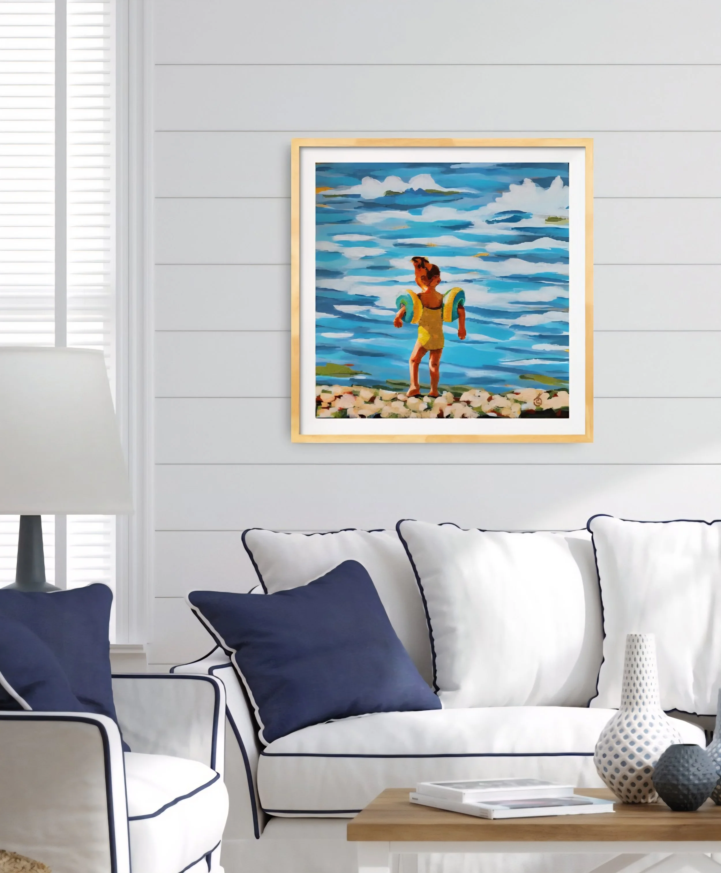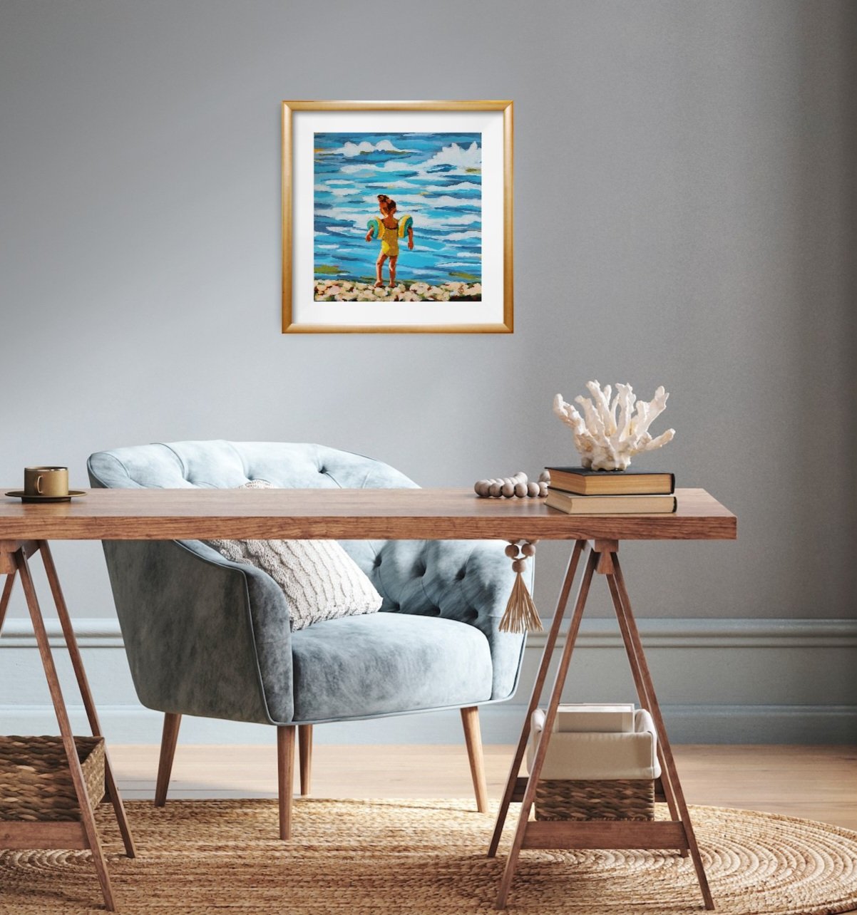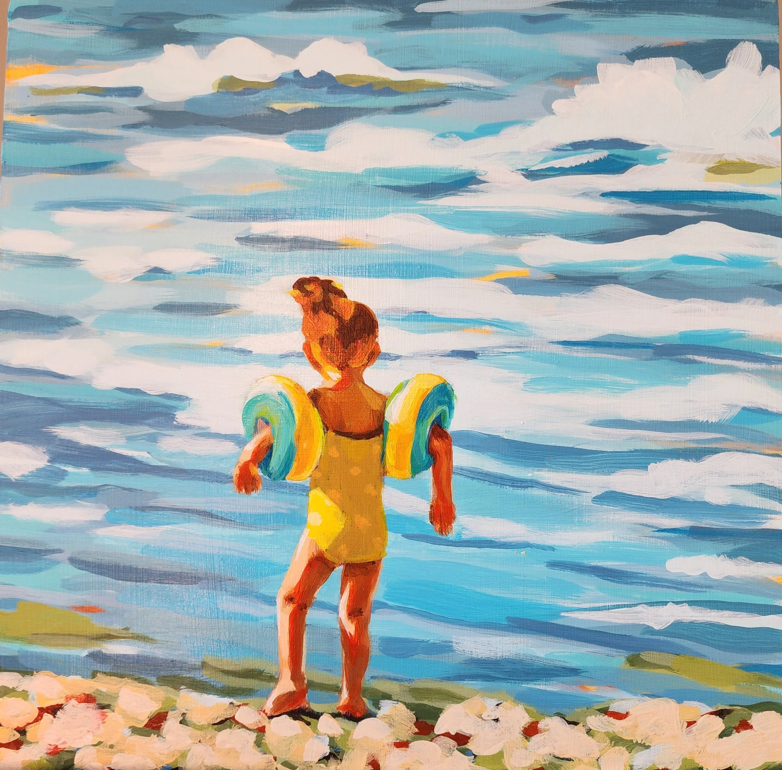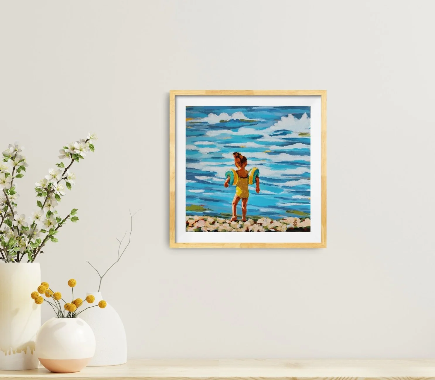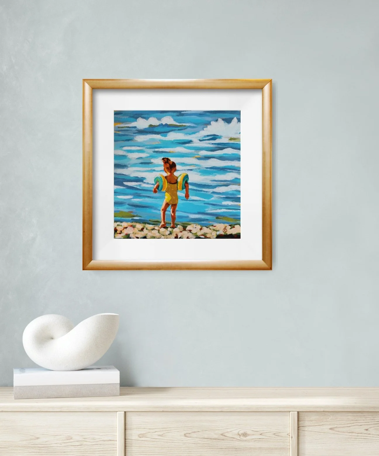“The Girl in the Yellow Polka Dot Swimsuit“ captures a gentle glimmer moment — the hush of freshwater and the soft courage it takes to step in. A nostalgic reflection of slow summer days, lake water shimmering, and childhood memories that ripple on long after the season fades.